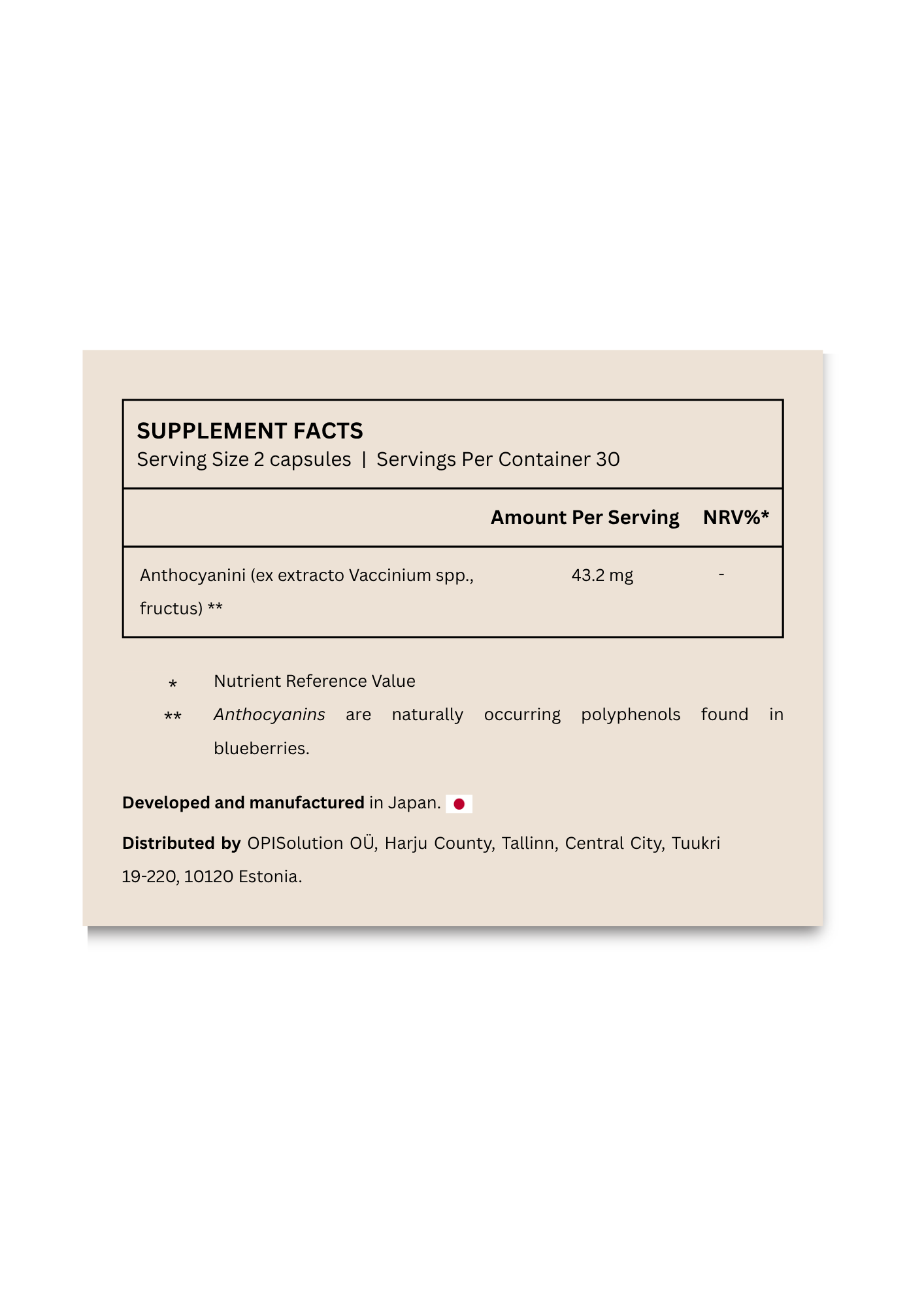 | Anthocyanins (from Bilberry extract, Vaccinium spp. fruit) | 43.2 mg | - |