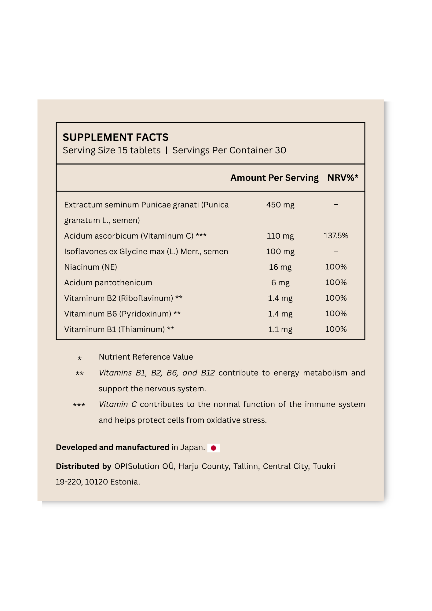 Ingredients (in descending order by weight): Maltodextrin, Pomegranate seed extract (Punica granatum L., seeds), Vitamin C (L-ascorbic acid), Soy isoflavones (Glycine max (L.) Merr., seeds), Whey minerals (milk-derived), Emulsifier: sucrose fatty acid esters (E473), Anti-caking agent: silicon dioxide (E551), Acidity regulator: calcium phosphates (E341), Niacin (nicotinamide), Vitamin B2 (riboflavin), Vitamin B6 (pyridoxine hydrochloride), Vitamin B1 (thiamine mononitrate), Vitamin B5 (Calcium D-pantothenate).