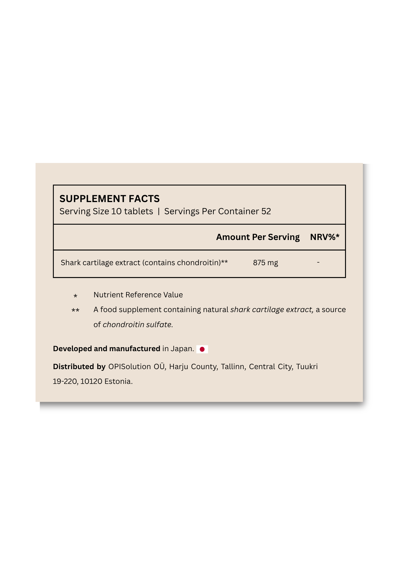 | Shark cartilage extract (Squalus suckleyi, source of chondroitin) | 875 mg | - |